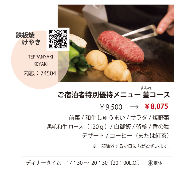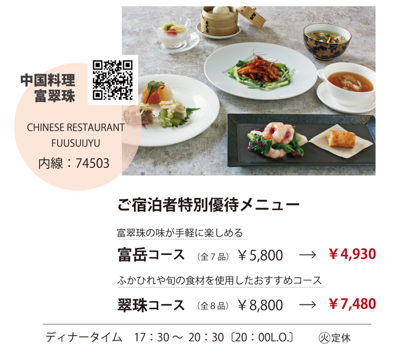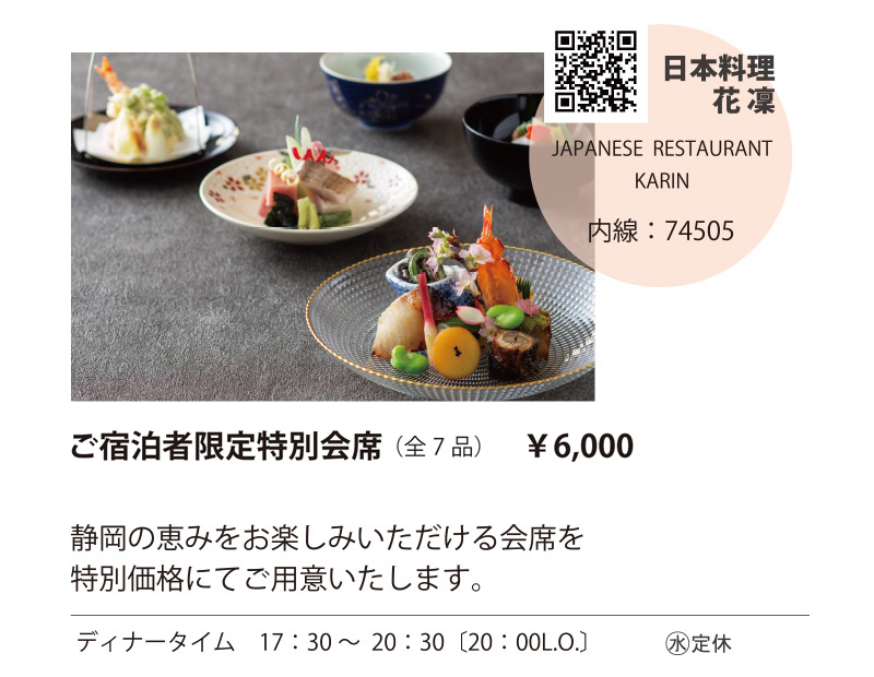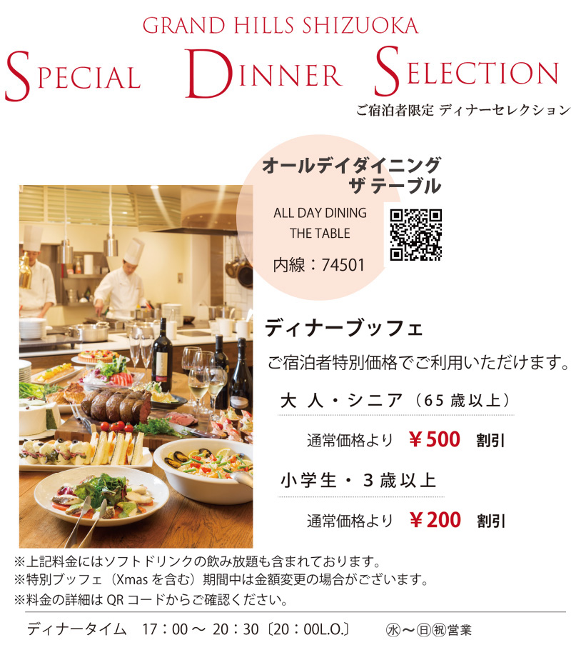 / 最終更新日 : 2026年2月16日 ホテルグランヒルズ静岡 2026年2月16日 ご宿泊者専用ページ レストラン・バー ご優待 ご滞在中のサービス / ご朝食 お得なレストラン・バー ご優待 ※2026.3.20~31は菫コースをお休みいたします。 ※上記期間は「立葵コース」12,000円を【15%割引】10,200円でご優待いたします。 【ご注意】 *イベント開催時など一部除外日がございます。 *詳細は各店舗までお問い合わせください。 *サービス料・消費税込の料金です。 *各種ご優待、特典との併用はできません。 *写真はイメージです。 《TOPに戻る》