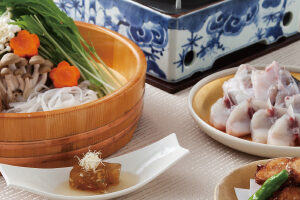旬の味覚をふんだんに盛り込んだ「季節会席」と旬のふくを使用した「ふく鍋」を