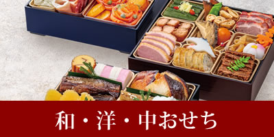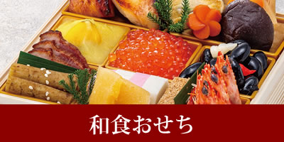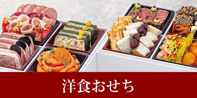 伊達巻玉子/紅白蒲鉾/子持鮎甘露煮/銀鱈西京焼/目梶木照焼/叩き牛蒡/菊花蕪/栗金団/松風/筍土佐煮/梅人参/海老芝煮/数の子/黒豆/紅白千代呂木/田作り