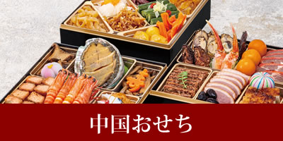 チャーシュー/巻き湯葉と干し椎茸の醤油煮/胡瓜と生姜の甘酢漬け/くらげの冷製/寿人参の甘酢漬け/紅白梅型まんじゅう/鮑の香料煮/きのこの香料煮/金柑の金木犀シロップ漬け/鮭の黒酢風味/牛肉のゼリー寄せ/白身魚、海老のすり身湯葉巻き揚げ/鶴型蒲鉾/あい鴨の冷製 山椒風味