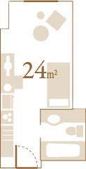 | Size: 24 m2 / Number of people: 1 to 2 / Floor: 19th to 25th floor / Bed size: 140 cm wide |